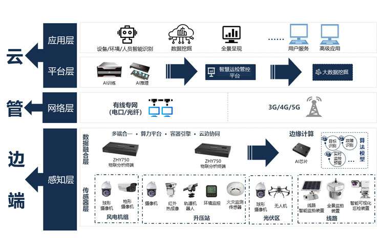 在风电机组、光伏区、升压站和线路各场景中,安装可视化监控装置、运检机器人和各类传感器,采用“机器人+高清视频”的联合运检方式,结合人工智能图像识别技术自动识别设备、人员、环境异常信息,深度融合新能源场站运检规程,搭建统一的智慧运检管控平台,实现24小时不间断智能运检、更快发现现场安全隐患,减轻运维人员巡视压力,提高运维巡视效率,实现场站“无人值守、少人值班、集中监控”。